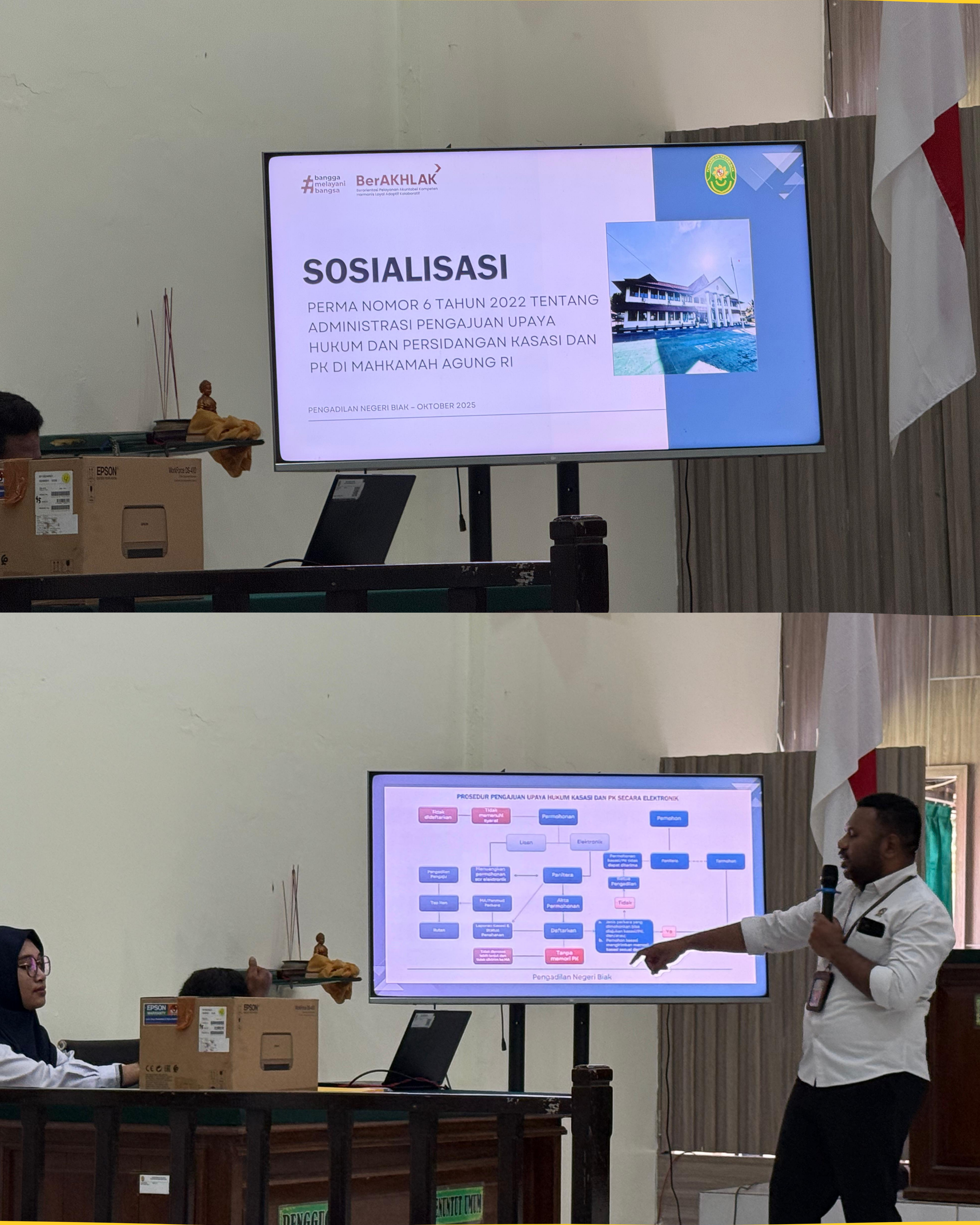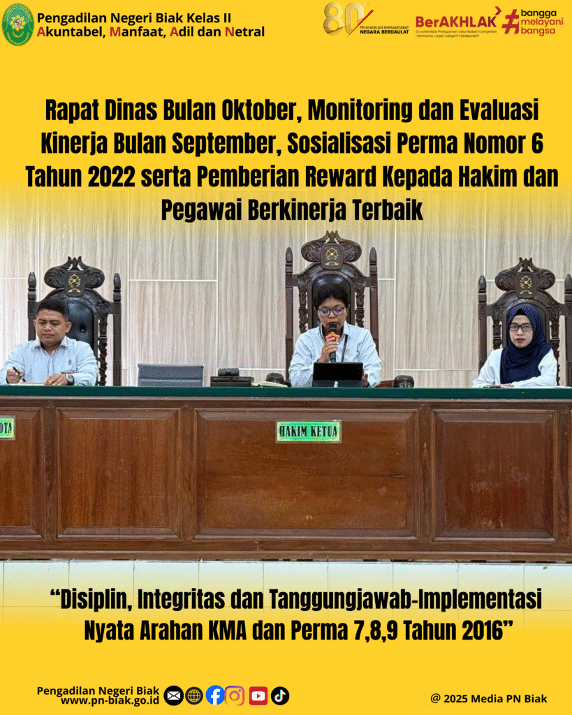Pengadilan Negeri Biak melaksanakan Rapat Dinas Bulanan Oktober yg dipimpin oleh Ibu Wakil Ketua Gracely Novendra Manuhutu S.H yang dirangkaikan dengan Monitoring dan Evaluasi Kinerja Bulan September, serta Sosialisasi PERMA Nomor 6 Tahun 2022 tentang Administrasi Perkara dan Persidangan Elektronik di Lingkungan Peradilan yang di sampaikan oleh Bpk. Hendri Marthen Okoka,S.H.
